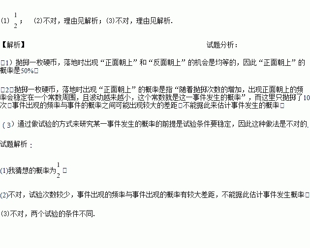 (2)一位同学在做这个试验时说:“我只做了10次试验就得到了正面朝上的概率约为30%.”你认为他说的对吗?为什么?