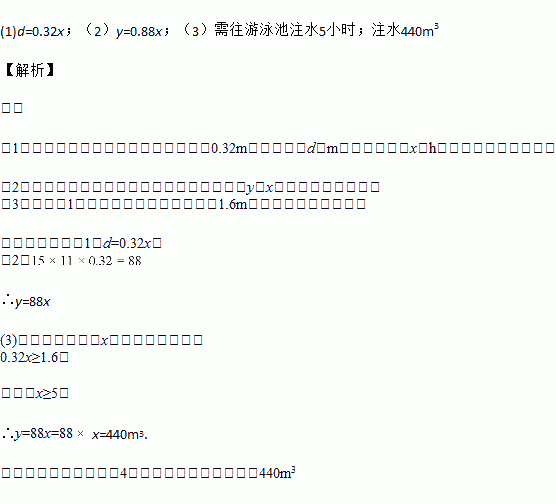 (3)如果水深1.6m时即可开放使用,那么需往游泳池注水几小时?注水多少(单位:m3)?