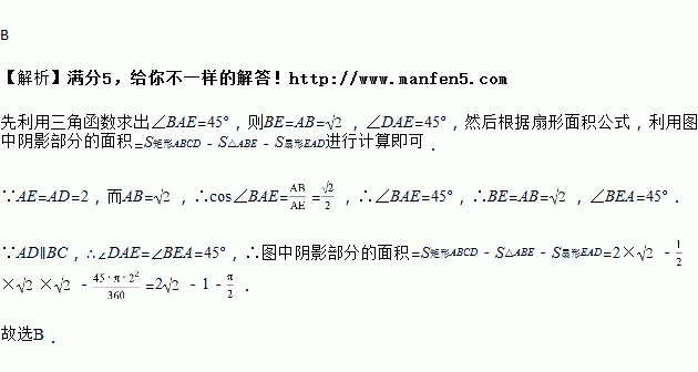 如图,在矩形ABCD中,AB=,AD=2,以点A为圆心,AD的长为半径的圆交BC边于点E,则图中阴影部分的面积为( )