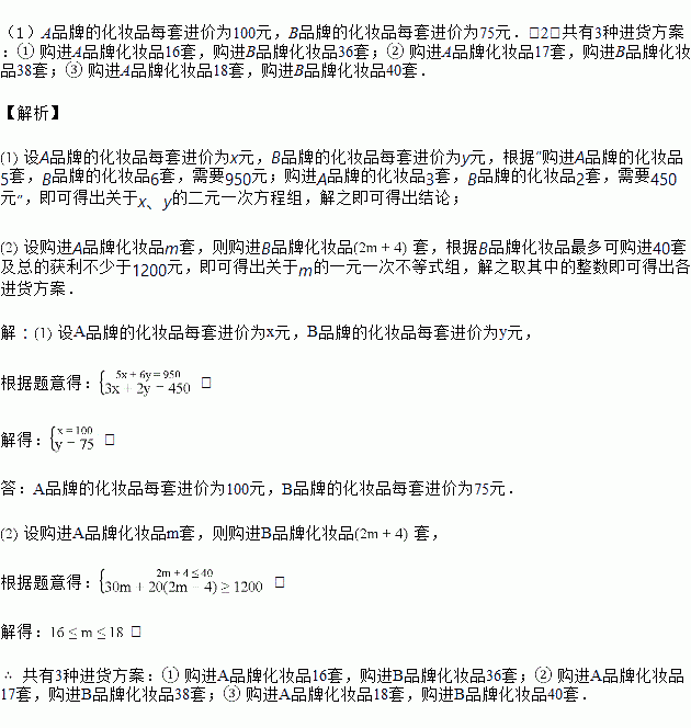 求A、B两种品牌的化妆品每套进价分别为多少元?![]()