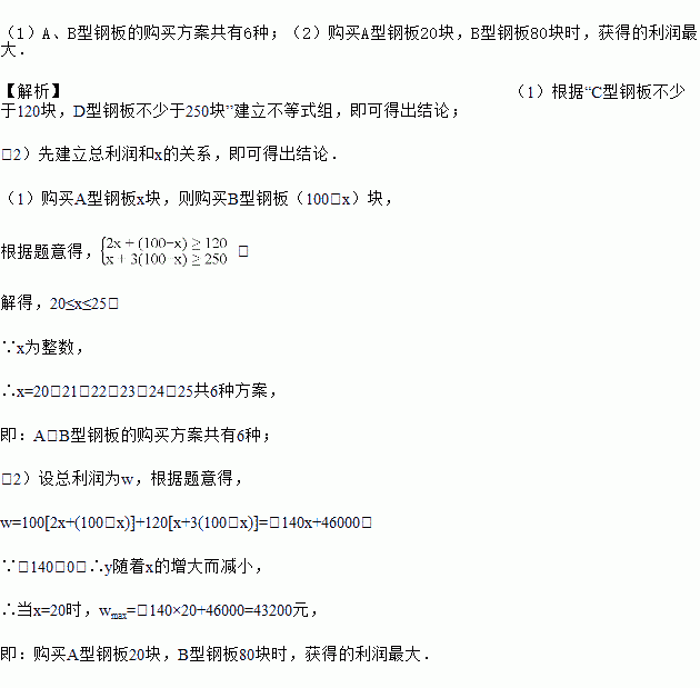(2)出售C型钢板每块利润为100元,D型钢板每块利润为120元.若将C、D型钢板全部出售,请你设计获利最大的购买方案.