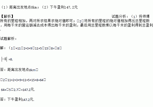 (1)距离出发地点8km;(2)下午盈利147.2元 【解析】试题分析:(1)将师傅所有的里程相加,再对所求结果求绝对值即可;(2)将所有的里程的绝对值相加得出总里程数,用每千米的营运额减去成本得出每千米的盈利,最后用总里程数乘以每千米的盈利得到总盈利. 试题解析: 【解析】 (1)+11-2+3+9-11+5-15-8=-8, =8. 答:距离出发地点8km; ...
