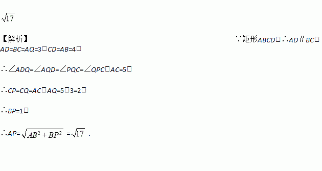 如图,矩形ABCD中,AB=4,AD=3,点Q在对角线AC上,且AQ=AD,连接DQ并延长,与边BC交于点P,则线段AP=_________.