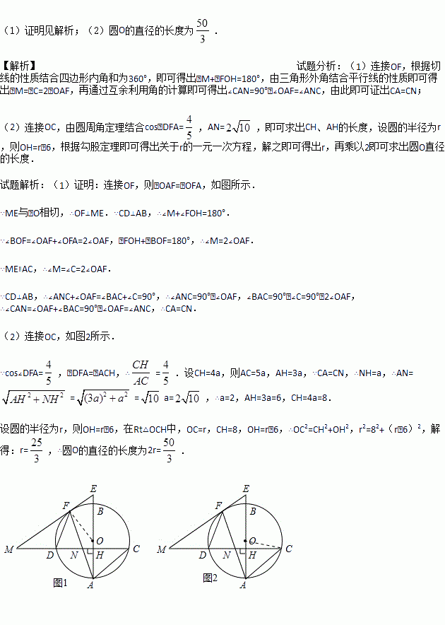 如图,已知AB是圆O的直径,弦CD⊥AB,垂足为H,与AC平行的圆O的一条切线交CD的延长线于点M,交AB的延长线于点E,切点为F,连接AF交CD于点N.