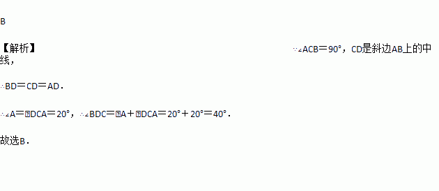 如图,在直角三角形ABC中,CD是斜边AB上的中线 ,若∠A=20°,则∠BDC=( )