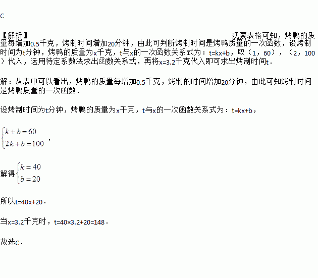 C ¡¾½âÎö¡¿¹Û²ì±í¸ñ¿ÉÖª£¬¿¾Ñ¼µÄÖÊÁ¿Ã¿Ôö¼Ó0.5ǧ¿Ë£¬¿¾ÖÆÊ±¼äÔö¼Ó20·ÖÖÓ£¬ÓÉ´Ë¿ÉÅжϿ¾ÖÆÊ±¼äÊÇ¿¾Ñ¼ÖÊÁ¿µÄÒ»´Îº¯Êý£¬Éè¿¾ÖÆÊ±¼äΪt·ÖÖÓ£¬¿¾Ñ¼µÄÖÊÁ¿Îªxǧ¿Ë£¬tÓëxµÄÒ»´Îº¯Êý¹ØÏµÊ½Îª£ºt=kx+b£¬È¡£¨1£¬60£©£¬£¨2£¬100£©´úÈ룬ÔËÓôý¶¨ÏµÊý·¨Çó³öº¯Êý¹ØÏµÊ½£¬ÔÙ½«x=3.2ǧ¿Ë´úÈë¼´¿ÉÇó³ö¿¾ÖÆÊ±¼ät£® ¡¾½âÎö¡¿ ´Ó±íÖпÉÒÔ¿´³ö£¬¿¾Ñ¼µÄÖÊÁ¿Ã¿Ôö¼Ó0.5ǧ¿Ë£¬¿¾ÖƵÄʱ¼äÔö¼Ó20·ÖÖÓ£¬ÓÉ...