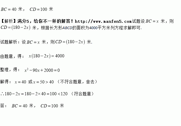 如图,某工程队在工地互相垂直的两面墙AE、AF处,用180米长的铁栅栏围成一个长方形场地ABCD,中间用同样材料分割成两个长方形. 已知墙AE长120米,墙AF长40米,要使长方形ABCD的面积为4000平方米,问BC和CD各取多少米?