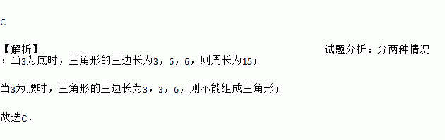 C 【解析】试题分析:分两种情况:当3为底时,三角形的三边长为3,6,6,则周长为15; 当3为腰时,三角形的三边长为3,3,6,则不能组成三角形; 故选C.