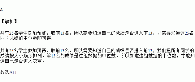 某校有25名同学参加某比赛,预赛成绩各不相同,取前13名参加决赛,其中一名同学已经知道自己的成绩,能否进入决赛,只需要再知道这25名同学成绩的( )