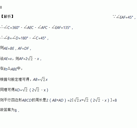 如图,在平行四边形ABCD中,AE⊥BC于E,AF⊥CD于F,∠EAF=45°,且AE+AF=2,则平行四边形ABCD的周长是_____.