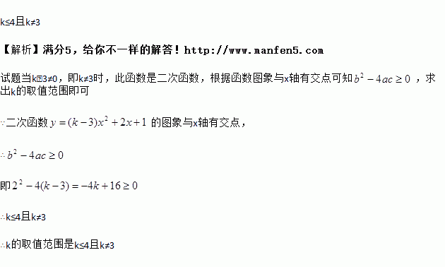 已知函数y=(k﹣3)x2+2x+1的图象与x轴有交点,则k的取值范围为_____.