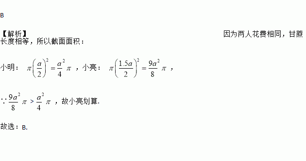 B 【解析】因为两人花费相同,甘蔗长度相等,所以截面面积: 小明: ,小亮: , ∵> ,故小亮划算. 故选:B.
