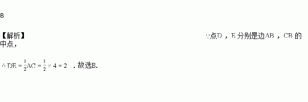 如图,在△ABC中,AB=3, BC=6,AC=4,点D, E分别是边AB,CB的中点,那么DE的长为( )