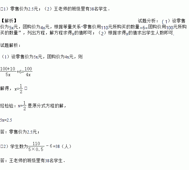 元旦晚会上,王老师要为她的学生及班级的六位科任老师送上贺年卡,网上购买贺年卡的优惠条件是:购买50或50张以上享受团购价.王老师发现:零售价与团购价的比是5:4,王老师计算了一下,按计划购买贺年卡只能享受零售价,如果比原计划多购买6张贺年卡就能享受团购价,这样她正好花了100元,而且比原计划还节约10元钱;
