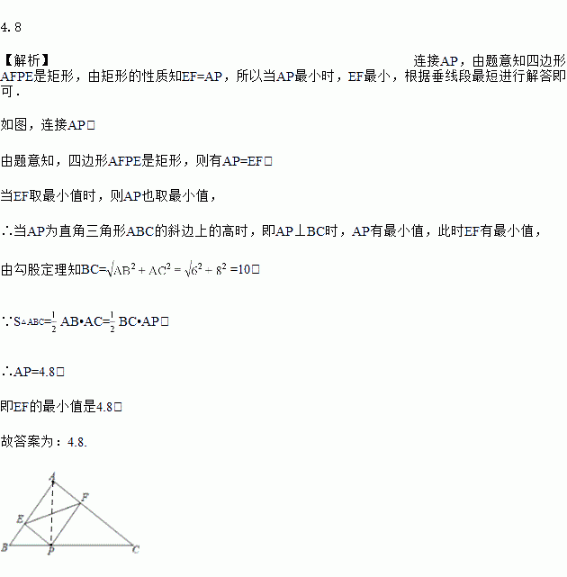 如图,Rt△ABC中,∠BAC=90°,AB=6,AC=8,P为BC上一动点,PE⊥AB于E,PF⊥AC于F,则EF最小值是________.