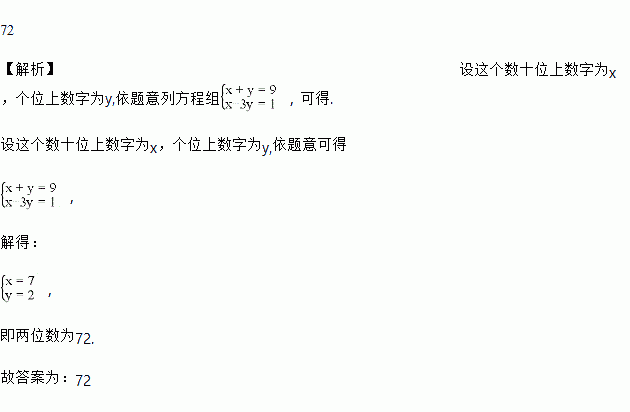 一个两位数,已知十位数字与个位数字之和等于9,且十位数字比个位数字的3倍大,则这个两位数是____________。