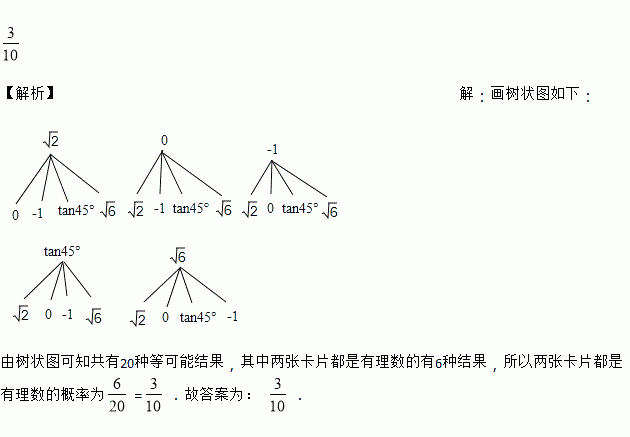 五张卡片正面分别标有、0、tan45°、-1、,每张卡片的背面完全相同,则随机抽两张卡片都是有理数的概率是__________.