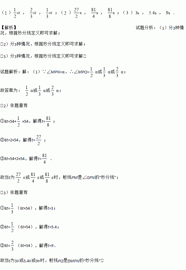 (3)若射线PM同时绕点P以每秒6°的速度顺时针旋转,并与PQ同时停止.请求出当射线PQ 是∠MPN的“妙分线”时t的值.