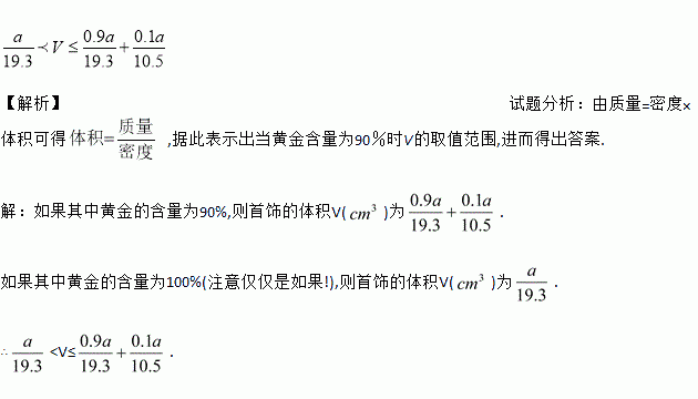 .一件由黄金与白银制成的首饰重a克,商家称其中黄金含量不低于90%,黄金和白银的密度分别是19.3和10.5,列出不等式表示这件首饰的体积应满足什么条件.(提示:质量=密度×体积.)