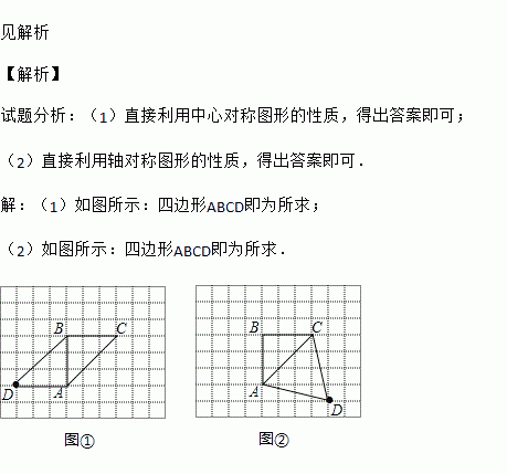 见解析 【解析】 试题分析:(1)直接利用中心对称图形的性质,得出答案即可; (2)直接利用轴对称图形的性质,得出答案即可. 【解析】 (1)如图所示:四边形ABCD即为所求; (2)如图所示:四边形ABCD即为所求.
