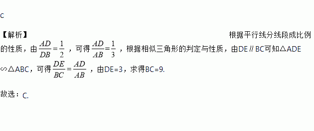 如图,在△ABC中,点D、E分别是边AB、AC上的点,且DE∥BC,若,DE=3,则BC的长度是( )