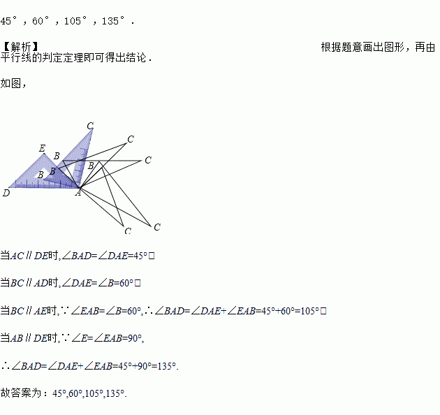 一副直角三角尺叠放如图 1 所示,现将 45°的三角尺ADE 固定不动,将含 30°的三角尺 ABC 绕顶点 A 顺时针转动(旋转角不超过 180 度),使两块三角尺至少有一组边互相平行.如图 2:当∠BAD=15°时,BC∥DE.则∠BAD(0°<∠BAD<180°)其它所有可能符合条件的度数为________.