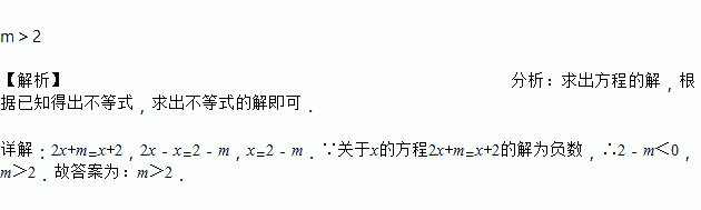 已知关于x的方程2x+m=x+2的解是负数,则m的取值范围是_________。