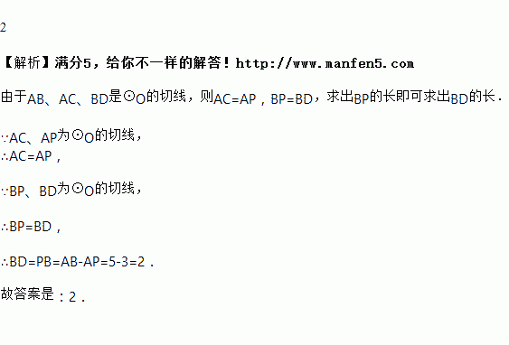 如图,AB,AC,BD是⊙O的切线,P,C,D为切点.若AB=5 cm,AC=3 cm,则BD的长为________ cm.