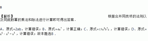 A. -3ab+5ab=2a2b2 B. (-2a2)2•a3=4a7 C. 3a2b•5ab4c=8a 3b5c D. (-a)6÷a3=a2