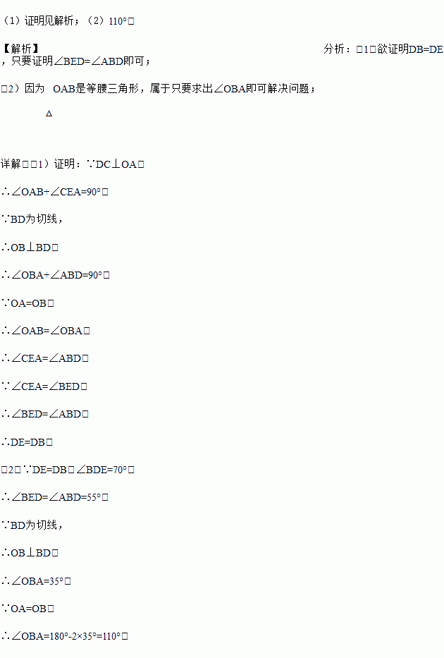 如图所示,AB是⊙O的一条弦,DB切⊙O于点B,过点D作DC⊥OA于点C,DC与AB相交于点E.