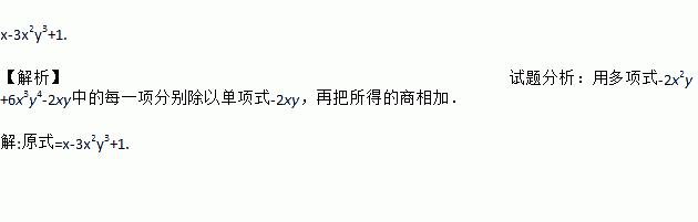 x-3x2y3+1. 【解析】试题分析:用多项式-2x2y+6x3y4-2xy中的每一项分别除以单项式-2xy,再把所得的商相加. 解:原式=x-3x2y3+1.
