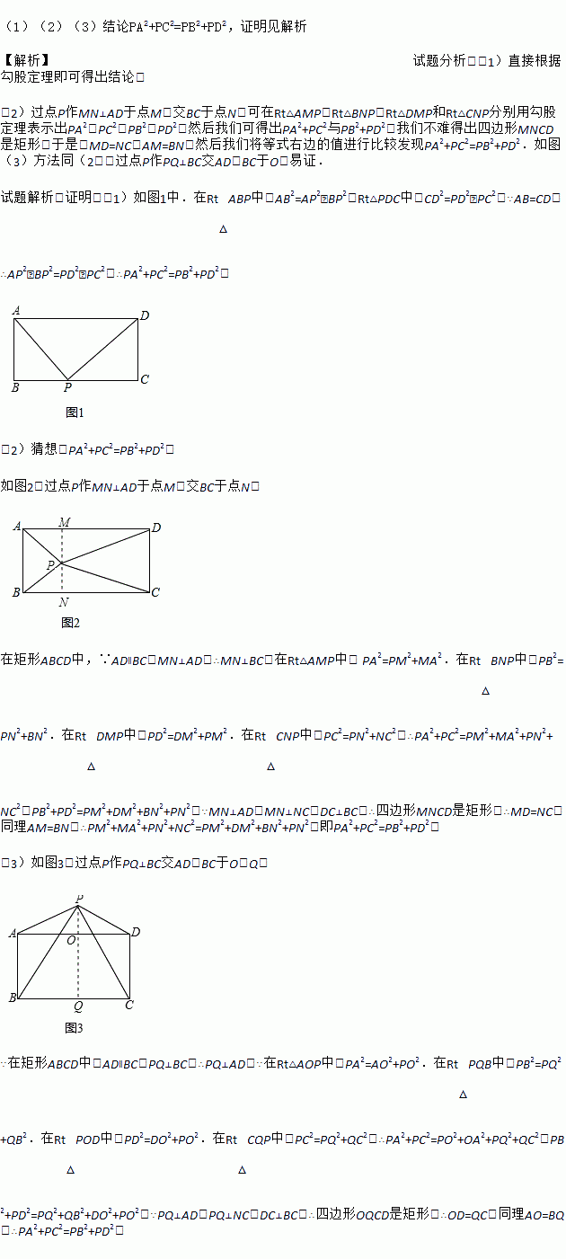 (1)ÒÑÖª¾ØÐÎABCDºÍµãP£¬µ±µãPÔÚBCÉÏÈÎһλÖã¨Èçͼ1Ëùʾ£©Ê±£¬Ì½¾¿PA2¡¢PB2¡¢PC2¡¢PD2£¬Ö®¼äµÄ¹ØÏµ£¿Ö±½Óд³ö½áÂÛ£¬²»±ØÖ¤Ã÷£»
