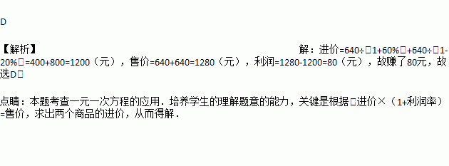 A. 赔了24元 B. 赚了32元 C. 赔了64元 D. 赚了80元