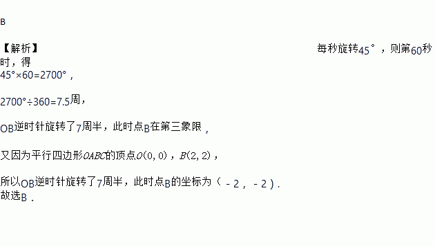 如图,平行四边形OABC的顶点O(0,0),B(2,2),若平行四边形绕点O逆时针旋转,每秒旋转45°,则第60秒时,顶点B的坐标为( )