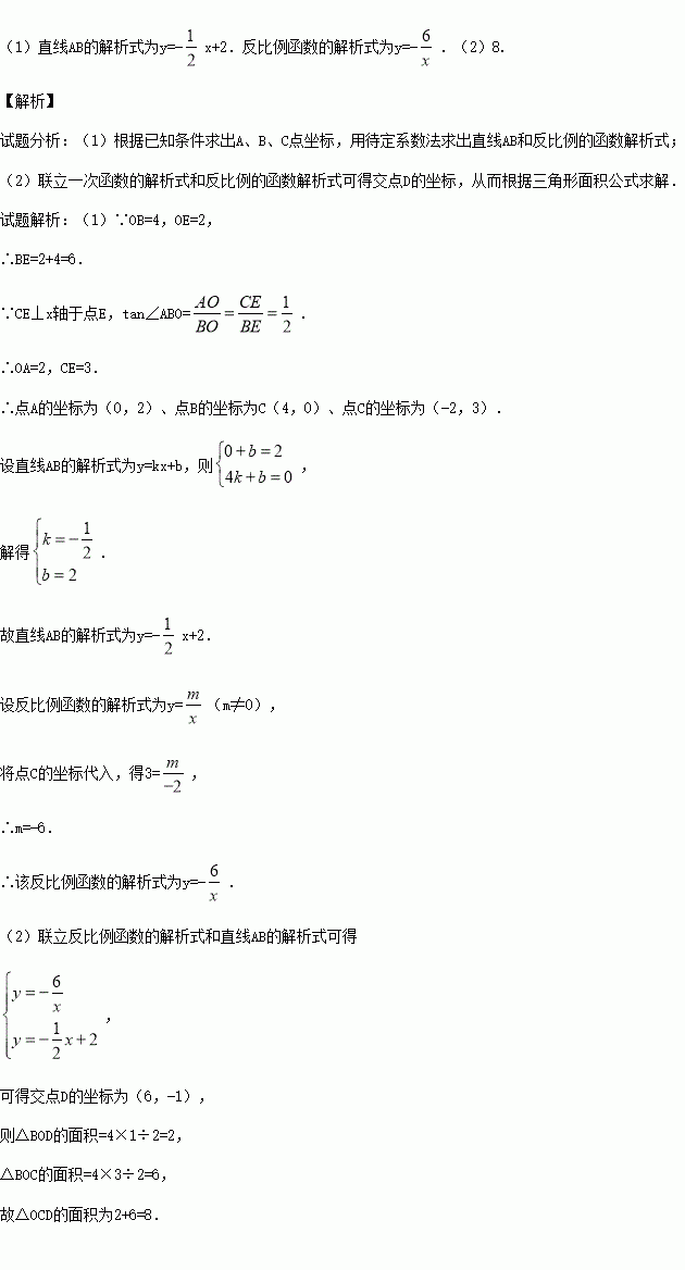 如图,在平面直角坐标系中,O为原点,直线AB分别与x轴、y轴交于B和A,与反比例函数的图象交于C、D,CE⊥x轴于点E,tan∠ABO=