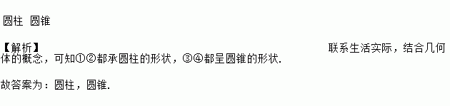 圆柱 圆锥 【解析】联系生活实际,结合几何体的概念,可知①②都承圆柱的形状,③④都呈圆锥的形状. 故答案为:圆柱,圆锥.