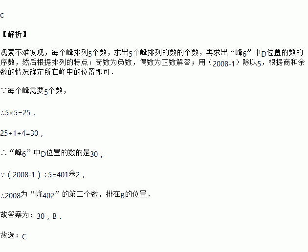 将一列有理数﹣1,2,﹣3,4,﹣5,6,……,按如图所示有序排列,根据图中的排列规律可知,“峰1”中峰顶的位置(C的位置)是有理数4,那么,“峰6”中D的位置是有理数( ),2008应排在A、B、C、D、E中的( ) 位置.其中两个填空依次为( )
