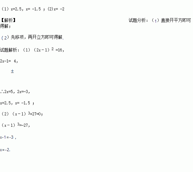 (1)(2x﹣1)2 =16 (2)(x﹣1)3+27=0;