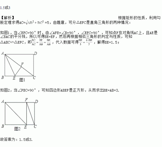 如图,矩形纸片ABCD,AD=4,AB=3,如果点E在边BC上,将纸片沿AE折叠,使点B落在点F处,联结FC,当△EFC是直角三角形时,那么BE的长为________.