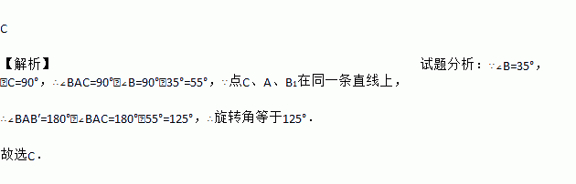 C 【解析】试题分析:∵∠B=35°,∠C=90°,∴∠BAC=90°﹣∠B=90°﹣35°=55°,∵点C、A、B1在同一条直线上, ∴∠BAB′=180°﹣∠BAC=180°﹣55°=125°,∴旋转角等于125°. 故选C.