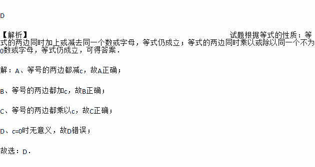A. 如果a=b,那么a﹣c=b﹣c B. 如果a=b,那么a+c=b+c