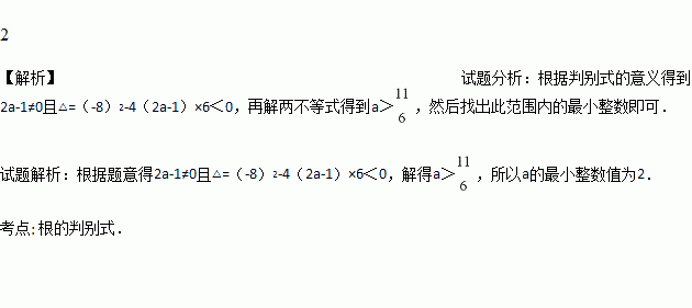 已知方程(2a-1)x2-8x+6=0没有实数根,则a的最小整数值是_______________.