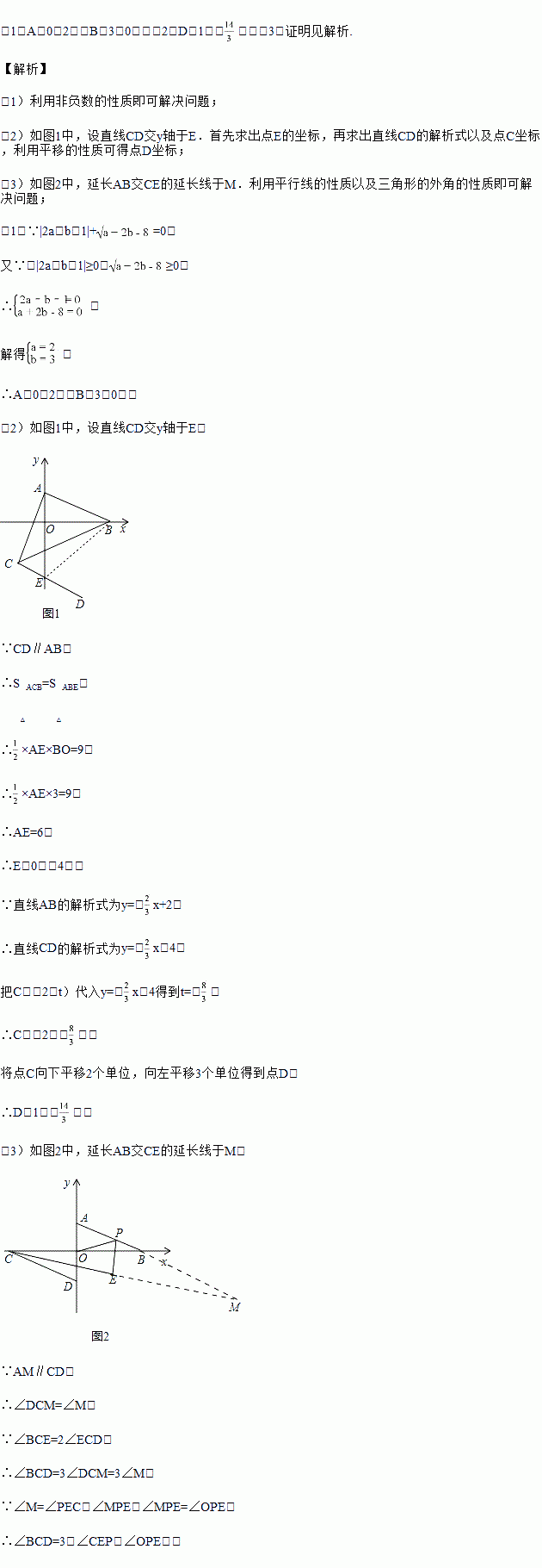 (3)平移线段AB到CD,若点C、D也在坐标轴上,如图2所示,P为线段AB上的一动点(不与A、B重合),连接OP,PE平分∠OPB,∠BCE=2∠ECD.求证:∠BCD=3(∠CEP﹣∠OPE).