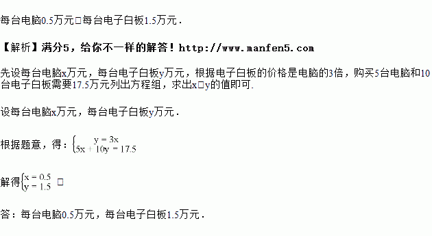 在汕头市中小学标准化建设工程中,某学校计划购进一批电脑和电子白板,经过市场考察得知,电子白板的价格是电脑的3倍,购买5台电脑和10台电子白板需要17.5万元,求每台电脑、每台电子白板各多少万元?