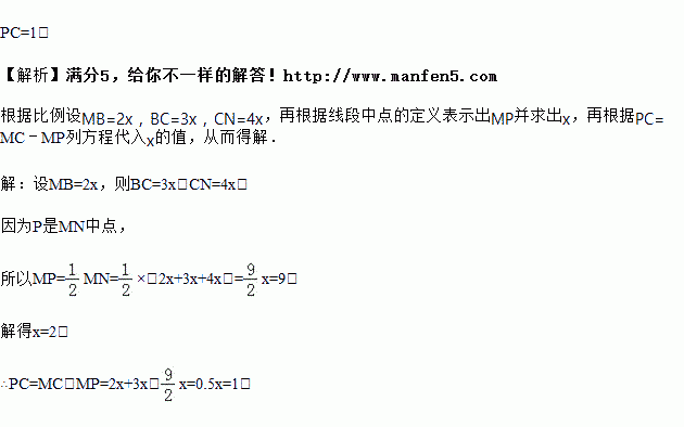 如图,点 B、C 把线段 MN 分成三部分,其比是 MB:BC:CN=2:3:4,P 是 MN 的中点,且 MN=18cm,求 PC 的长.
