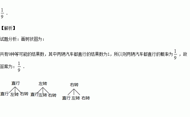 经过某十字路口的汽车,可直行,也可向左转或向右转,如果这三种可能性大小相同,则两辆汽车经过该十字路口时都直行的概率是 .