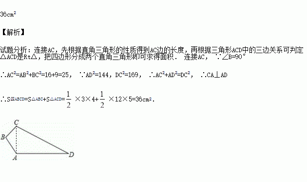 如图,在四边形ABCD中,已知AB=4cm,BC=3cm,AD=12cm,DC=13cm,∠B=90°,则四边形ABCD的面积为 .