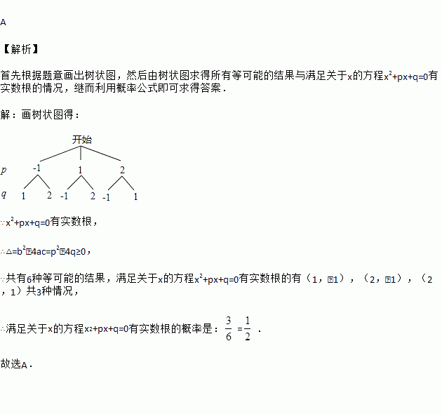 一个盒子里有完全相同的三个小球,球上分别标上数字-1、1、2.随机摸出一个小球(不放回),其数字记为p,再随机摸出另一个小球,其数字记为q,则p,q使关于x的方程x2+px+q=0有实数根的概率是( )