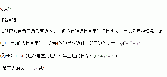 已知直角三角形的两边长分别为3、4.则第三边长为________.