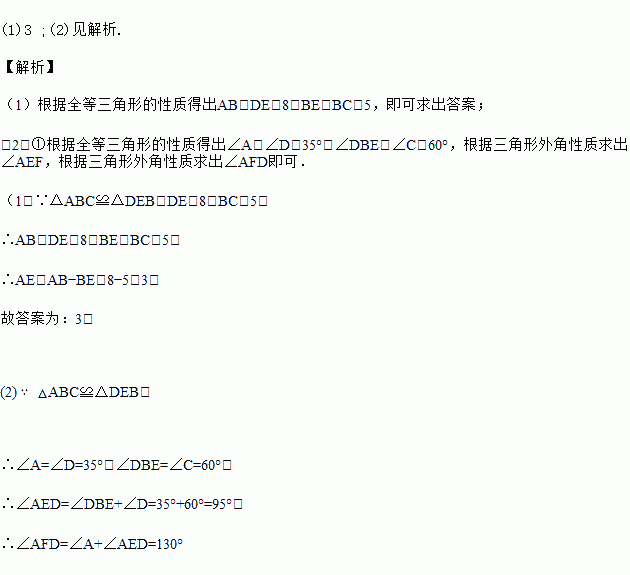 如图,△ABC≌△DEB,点E在AB上,DE与AC相交于点F.